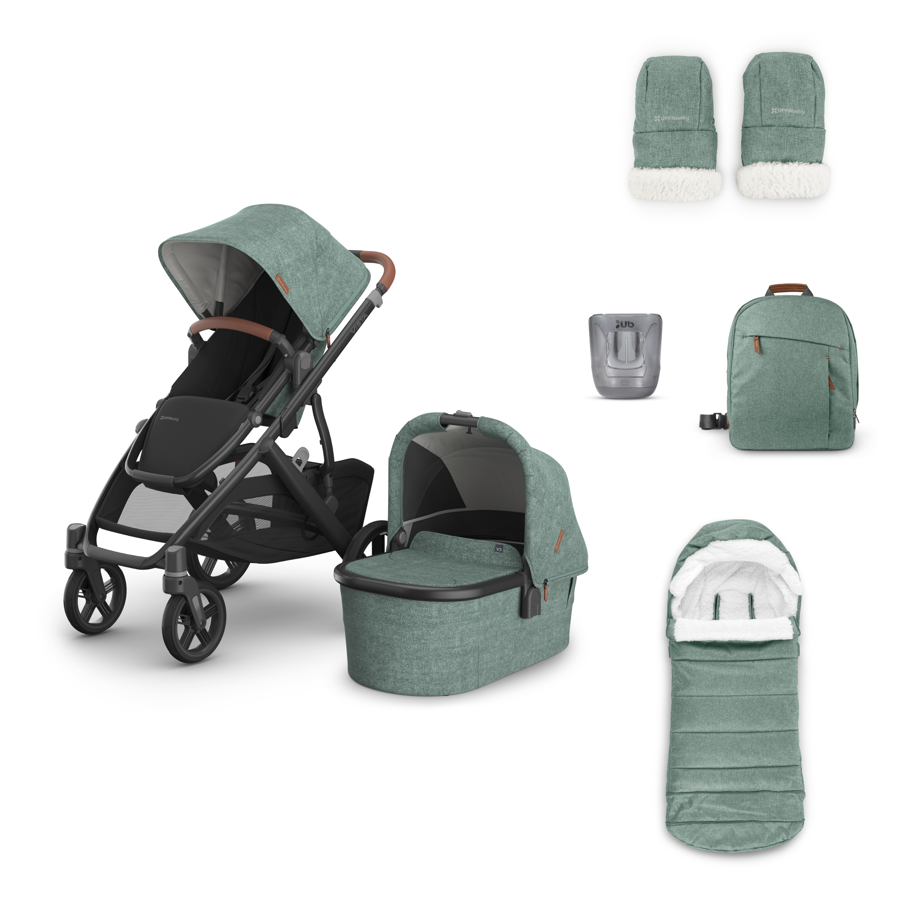 This bundle includes: stroller, carrycot, footmuff, changing backpack, cup holder, mittens + other accessories